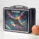 The moment a starship undocks from a space station or mother ship is captured on this space-themed lunch box. Colourful galaxies, stars and planets in the background complete the scene. Perfect for anyone who loves science fiction, outer space, and space exploration.