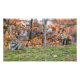 A fox and a racoon peer at one another as if wondering what to do next. Background of autumn colour.