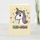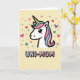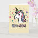 This card features the head of a cute, mythical horse-like creature set against a creamy yellow background, with a crisp black outline that makes the white face stand out. Its large black eyes, tiny lashes, and a soft rosy blush give it a tender, affectionate look that feels like a warm hug ❤️. A spiral horn rises from the forehead, striped in yellow and black with a pale blue base, adding a dreamy touch. The flowing mane sweeps to the side in gentle waves of pastel pink, light blue, and teal, like a soft ribbon drifting in the air. Below the illustration, the text “UNI-MOM” sits centered in rounded, puffy letters filled with a light blue-to-pink-to-white gradient and edged in black. Small hearts and star shapes sprinkled around the character add a sweet, friendly energy 🌼. Pastel hearts, stars, and tiny dots in pink, purple, teal, and light blue scatter across the background like confetti around the centered word.
