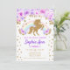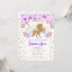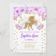 Unicorn First Birthday Party Invitation. Cute design in faux glitter gold with floral accent. Invite card with glitter unicorn silhouette, rainbow, stars and script font. Purple, lavender and white. Perfect for a stylish 1st bday celebration.