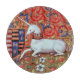 Colourful ,elegant fleur de lys and heraldic motives,floral swirls red blue,flowers with a white sitting unicorn ,digital elaboration from an ancient mediaeval miniature .