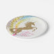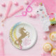 Unicorn baby shower paper plates with pretty gold unicorn on a pastel rainbow and gold heart background. These adorable unicorn baby shower paper plates are easily customised for your event by simply adding the text of your choice, and you can change the background colour.