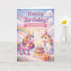 Featuring two adorable unicorns celebrating with a birthday cake, presents, and a rainbow-filled sky, this card includes the cheerful message:
