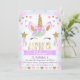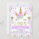 Looking for a unicorn birthday invitation with a little bling? This design features a unicorn face, two clouds, some hearts, faux gold stars and a purple banner. This is a cute way for your little girl to invite her guests to her unicorn themed party. The background includes a faint blue, purple and pink rainbow. This girl's magical unicorn birthday invitation is ready to be personalized. More unicorn themed invitation designs are available at the store.