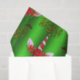 A gorgeous green and red unicorn Christmas tissue paper. The design features large red unicorn faces, with red and white striped horns and glittering eyelashes, pretty red Christmas poinsettia and holly in their hair, and all around are the golden words, 'Believe', made from Christmas decorations.