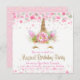 Unicorn birthday party invitations with adorable unicorn face with smiling gold eyelashes and floral horn on a beautiful pastel confetti bubble dot background. This cute unicorn birthday party invitation is easily customised for your event by simply adding your details. You can also change the background colour on this adorable unicorn invitation. This is a printed design with no real glitter.
