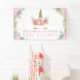 Unicorn baby shower banner with adorable pink and gold floral unicorn face with pretty gold eyelashes and horn on a beautiful pink and gold floral background. This cute unicorn baby shower banner is easily customised with the text of your choice.