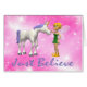 A sweet blonde fairy dressed in a little green dress is fondly admiring her beautiful white unicorn. When you need a little encouragement, just believe!