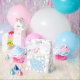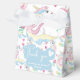 The design features a stylised unicorn head with a flowing pastel-coloured mane in shades of pink, blue, and yellow, adorned with sparkles. Surrounding the unicorn are decorative elements, including pink hearts, blooming flowers, and green leaves, creating a dreamy and whimsical aesthetic.