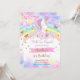 Four-ever magical girl birthday invite, unicorn, rainbow, stars, gold glitter.