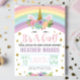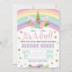 This is a unicorn themed baby shower invite. It's a girl! The design includes rainbows, stars, and glitter.