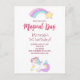 A birthday party invitation card for a girls 1st birthday party. A cute unicorn and a rainbow with star. With the text: Magical Day written with faux glitter, dark pink colour. White background. Templates for name, age 1 one, and party details.
