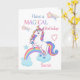 A cute and sweet magical unicorn birthday card design featuring a colorful unicorn standing on a cloud and Rainbow with a background of shooting stars and hearts.The card has the wording - Have a Magical Birthday in a colorful font . A sweet, cute and magical design for a little girl who could be your friend, daughter, granddaughter or niece. Can be personalized by amending the from name at the bottom of the card then change the message inside which currently reads , Have a Magical birthday, love XX