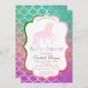 Cute holographic unicorn on mermaid scales baby shower invitation. These unicorn baby shower invitations are easily customised for your event by simply adding your details.