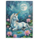 Step into a world of enchantment with this dreamy artwork featuring a majestic unicorn resting peacefully in a moonlit lily pond. Bathed in the soft glow of a full moon, the unicorn’s luminous white coat reflects the surrounding waters, creating a magical scene filled with calm and mystery. Surrounded by blooming pink lotus flowers and floating lily pads, this mythical creature’s horn evokes a sense of wonder and serene power. The deep blues and purples of the night sky form a captivating contrast with the ethereal light of the moon, drawing the viewer into a tranquil and otherworldly realm.