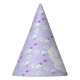 The design features a lavender background with white unicorn heads that have pastel pink, blue, and yellow flowing manes. Scattered throughout are fluffy blue-outlined clouds, pink hearts, and yellow stars. The elements are arranged in a seamless, whimsical pattern. The overall style is dreamy and fantasy-inspired.