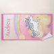 Unicorn Personalised Beach Towel. Background in hot pink (you can change this colour by selecting it, then select edit and you can change colour) or we will gladly assist.