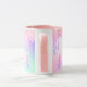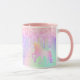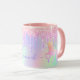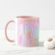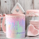 A trendy holographic background with unicorn and rainbow pastel colours in pink, purple, mint green. Decorated with drips in pink and purple and two unicorns. Personalise and add a name, written with a modern hand lettered style script with swashes. Purple coloured letters. To keep the swashes only delete the sample name, leave the spaces or emoji's in front and after the name.