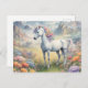 A postcard showing a dreamy image of a white unicorn with a rainbow mane standing in a field of flowers. In the background are majestic mountains. The perfect gift to give those who love magical and mystical unicorns. Contains generative content.