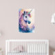 Poster of a majestic unicorn with a shimmering, colourful horn is depicted amidst a dreamy background of soft pastel colours. Its flowing mane is adorned with delicate flowers, creating an ethereal and enchanting scene.