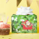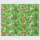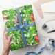 Christmas wrapping paper with a unicorn pulling Santa's sleigh towards a Xmas tree decorated with silver baubles. The unicorn has a red and golden mane and tail and the sleigh carries Santa along with many gifts. The background is simulated green glitter.