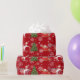 Elegant, modern, festive Christmas wrapping paper with a unicorn pulling Santa's sleigh towards a fir tree decorated with silver baubles. The unicorn has a red and golden mane and tail and the sleigh carries Santa along with many gifts. On a Christmas red background, with many cute snowflakes.