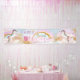 Unicorn birthday party banner with pastel pink purple and teal blue unicorn on a beautiful blue sky rainbow and gold cloud background. You can easily customise this unicorn birthday banner for your event by simply adding the text of your choice. You can also change the background colour on this pretty unicorn birthday party banner. This is a printed design with no real glitter.