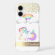 Adorable unicorn, rainbow , gold confetti and gold stripe on white background with your name.