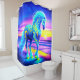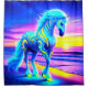 This shower curtain has a neon unicorn on it.