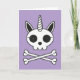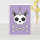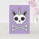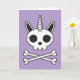 This graphic art piece combines the whimsical and the macabre, featuring a stylised skull with large, expressive eyes, a unicorn horn, and cat-like ears. As seen on Sophie's t-shirt, the skull is accompanied by crossbones, enhancing its playful yet gothic appeal. The design uses a simple black and white colour scheme, which emphasizes the bold and graphic nature of the illustration. This unique blend of elements makes it a perfect choice for those who appreciate a blend of fantasy, dark humour, and minimalist art.