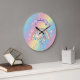 This cute and colourful custom wall clock features a beautiful illustration of a unicorn and pastel coloured rainbow, over a rainbow gradient background. Faux gold glitter accents the top and bottom portions. Little stars in matching colours surround the rainbow. A banner is printed above the unicorn with a sample name printed below in an elegant purple script font. The hours are printed in a soft pink glitter design. You can personalise the clock to include your own custom name or text.