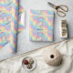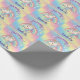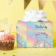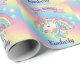 This cute and colourful wrapping paper features a beautiful illustration of a unicorn and pastel coloured rainbow, over a rainbow gradient background. Faux gold glitter accents the top and bottom portions of the illustration. Little stars in matching colours surround the rainbow. A sample Happy Birthday banner is printed above the unicorn, and a sample name is printed below in an elegant purple script font. You can personalise the gift wrap to include your own custom name or text.