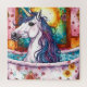 An adorable unicorn with a blue and purple mane soaks in the bathtub
