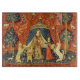 The Lady and The unicorn, a mediaeval tapestry from around 1500, is one of a set of French tapestries, considered great works of art from the Middle Ages. This Lady and the Unicorn tapestry is a stunning image of a lady standing in a tent, with a unicorn on one side of her, and a lion on the other. There's a little white dog sitting on a bench next to her, and a handmaiden on the other side. The tapestry's background is a red field of flowers and animals, including dogs, rabbits, and birds. The original mediaeval Unicorn tapestry was quite damaged and lost much of its original bright colouring and quality. While we were able to restore some of the Unicorn tapestry's original red and blue mediaeval colouring, please be aware that there are still imperfections in the image. However, ours is a unique version of this mediaeval tapestry, as we have extended it and enhanced it to bring out its original beauty.