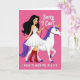 This greeting card shows a stylish young woman with long raven hair striding across a bright fuchsia background as she leads a calm white unicorn, and the two look like an inseparable pair. She wears a strapless white ruffled dress paired with crimson high-heeled boots, giving her a confident, date-night-meets-adventure look. A thin red leash runs from her hand to the unicorn, like a gentle link between friends who trust each other. The unicorn’s mane and tail are rich purple, and its horn gleams gold, adding a little magic to the otherwise flat, cartoon-like colors. At the top, the phrase “Sorry I Can’t” appears in white lettering, centered and easy to spot against the pink field. Along the bottom, “I Have To Walk My Unicorn” is also set in white, balancing the layout and framing the pair with a cheeky message 💚. The figures are outlined with strong, simple lines and minimal shading, with the purple hair, gold horn, and red boots standing out sharply on the fuchsia backdrop ☘️.