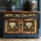 Decoupage Furniture Upcycling Tissue Paper. This design features a gentle, kind faced unicorn framed within delicate filigree patterns, red poppies, and soft jade foliage. Inspired by 19th century botanical motifs and the William Morris art nouveau tradition, it balances mythical imagery with detailed floral ornament. The top and bottom arches hold editable text, making it suitable for personalised gifting as well as creative craft projects.