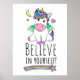 A sweet unicorn graces this design, accentuated by the moon, heart, and shooting star, and an inspirational slogan which reads "Believe In Yourself!"