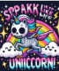 A cartoon unicorn prancing on a rainbow with sparkles and clouds.