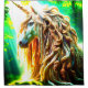 This shower curtain has a unicorn with dreadlocks pictured on it.