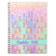 A trendy holographic coloured background with unicorn and rainbow pastel colours in pink, purple, mint green. Decorated with drips in pink and purple and a golden coloured unicorn pattern. Personalise and add a name and year written with a girly modern hand lettered style script. Purple coloured letters.