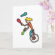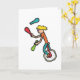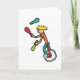 Unicycling design shows a juggler riding unicycle and juggling three clubs - as if either one of these skills wasn't hard enough. Bright fun unicycle image pays tribute to circus skills which teach coordination and balance.