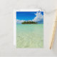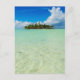 Postcard in vertical orientation of palm trees on an uninhabited or desert tropical island in the clear blue lagoon of the Pacific atoll Rangiroa, Tahiti, French Polynesia.