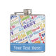 The flask itself is fine. It’s a cheap flask, obviously bought in bulk, however am prepared to overlook that. Given that it is a personalized item, I would have liked to have seen gift boxing instead of the generic packaging. Terrible printing, and/or quality. It’s a cheap, tacky vinyl. It is not cut straight and is also applied in a way that it is overhanging the bottom, causing the glue to catch on items and it will eventually roll and tear, damaging the wrap.