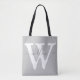 This stylish neutral grey and white tote bag features a modern style script signature overlay on an antique English vintage typography initial. This style is distressed and irregular, giving it a rustic old style earthy character. A blend of antique and modern typography to create a unique monogram style.