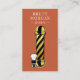 A fresh new take on a barber's business card, featuring a retro modern vibe, with gold glitter and black striped barber pole and a youthful unique burnt orange background to liven up your style. Depart from classic gold and black with this fresh twist on retro-modern. For men's hair cutting and grooming, shaves, beard trims and all barber services.