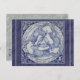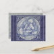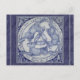 In rich blue shades on grey /white, my interpretation of an ancient design features three rabbits or hares sharing just three ears and chasing each other in a circle. My art was originally painted on glazed and kiln fired tiles as a four-tile mural. The traditional folk verse in the border reads, "Rabbits three and ears as few / Yet each rabbit has its two." This ancient design is found in old art and architecture throughout Europe and the middle east. The corners of the tiles are decorated with stylised birds and floral motifs inspired by chinoiserie blue and white pottery. The background is textured blue with thin grey stripes. The postcard's reverse is textured light grey. A unique, whimsical yet elegant postcard, suitable for any occasion. Original artwork & design by Tuzi Williams.