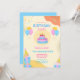 the design shows a birthday invitation for kids written in pink and sky blue with a colourful background and lots of birthday cake,birthday cap and gifts