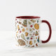 Unique fall Thanksgiving coffee mug hand drawn pattern with an orange sweater, warm scarf, cosy blanket, fall leaves, backpack, pumpkin spice coffee, mulled wine, pumpkin pie, fall candles, warm hat, gourd, autumn flowers, mushrooms, yellow pear, red apple, fall boots, cupcakes and warm socks. It's a unique November fall coffee mug for your cosy home. This cosy autumn coffee mug makes a perfect fall season gift for kids. Cosy October coffee mug with a fall season pattern is a unique coffee mug for her — you, your friend, girlfriend, mum, sister, daughter, aunt, niece, cousin and granddaughter. Get a Thanksgiving coffee mug with a cute one of a kind pattern now!