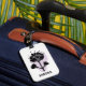 A sleek white luggage tag featuring a modern, stylized black floral design with abstract petals and stems, set against a subtle lavender teardrop background. Below the flower, the name "SANDRA" is printed in bold, artistic lettering, making it a personalized and elegant accessory.