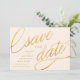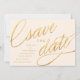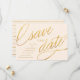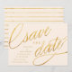 These unique, modern save the dates feature fancy script in a faux gold foil effect on a sweet champagne coloured background, with the wedding announcement details in white. The backer features a trendy gold stripe pattern. Change the background colour using the "Customise" tool!